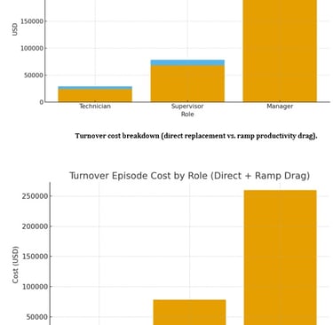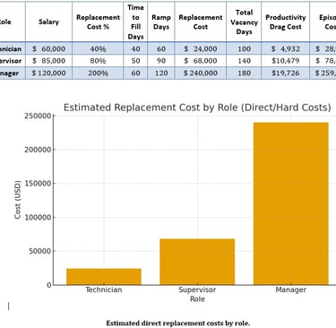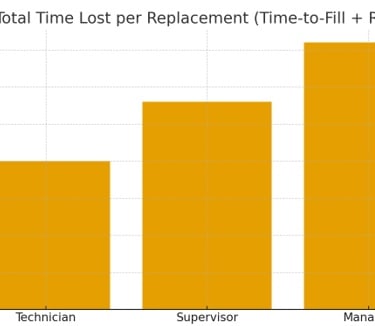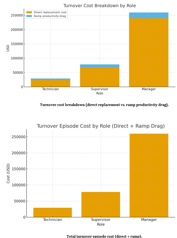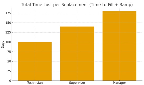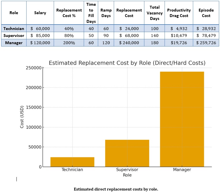 The table below summarizes conservative assumptions for three roles—Technician, Supervisor, and Manager—and the resulting cost and time impact of a single turnover event. You can update salaries and timelines to reflect your organization’s benchmarks.